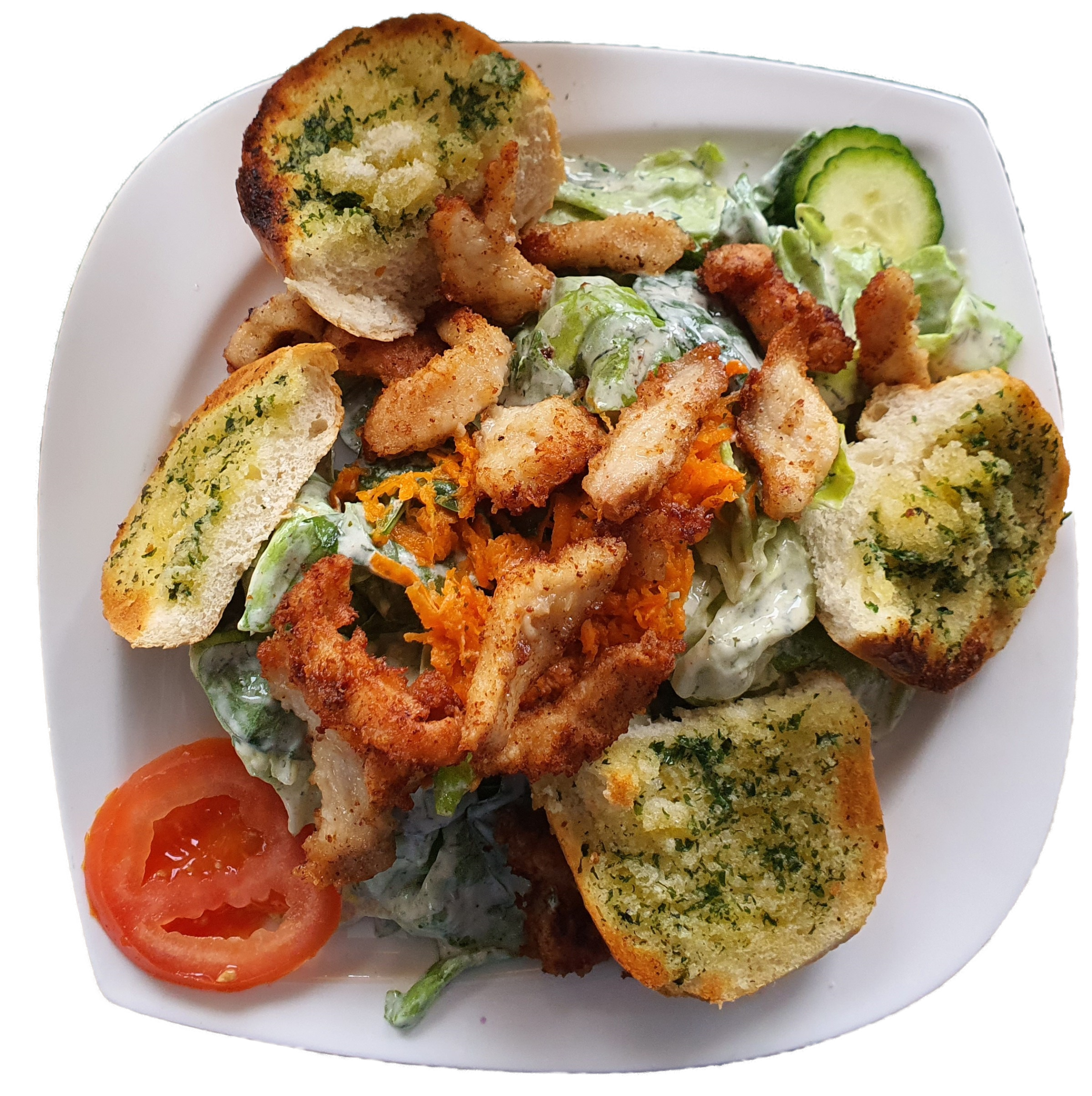Gemischter Salat mit Hähnchenbruststreifen & Knoblauchbrötchen