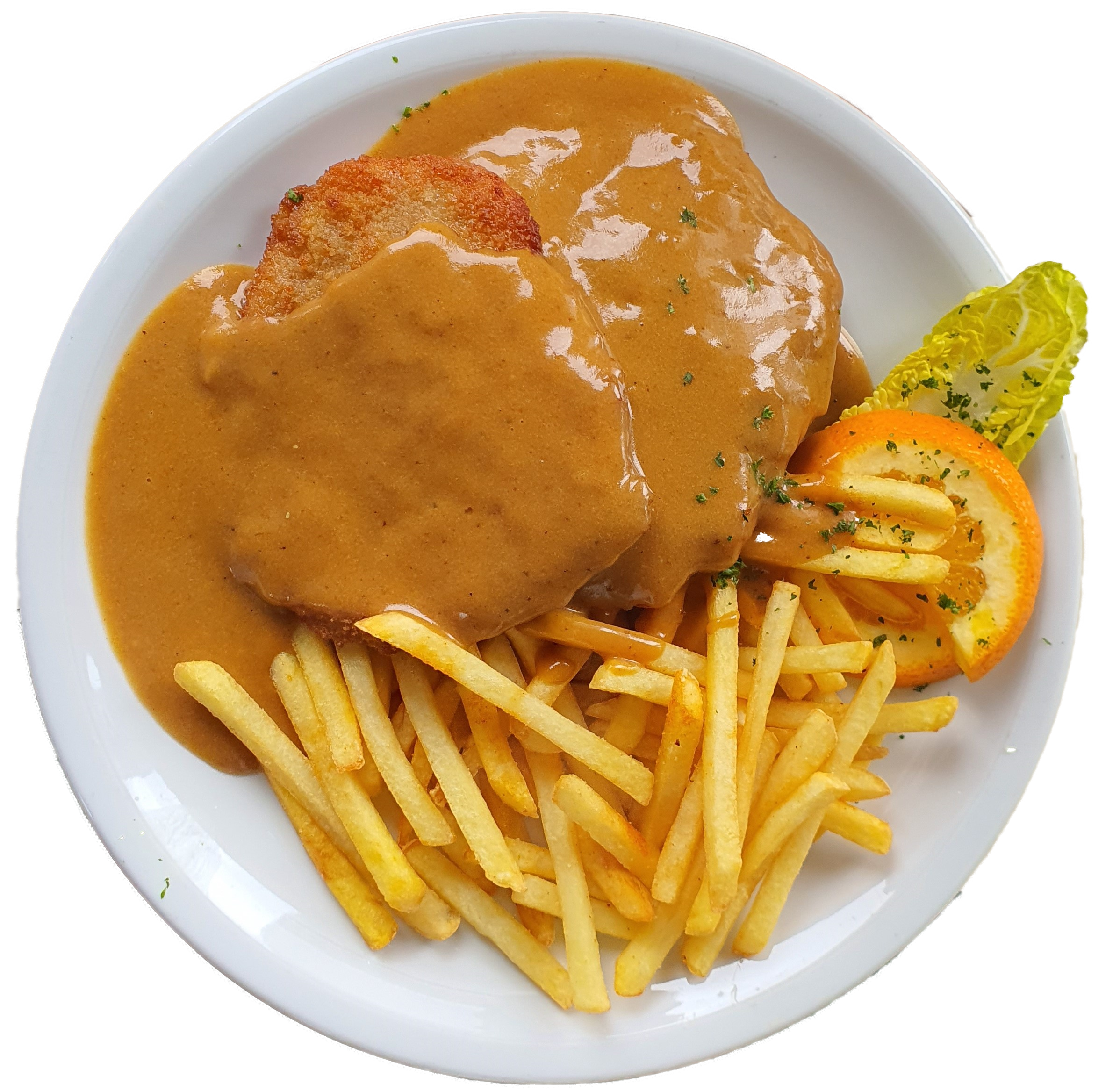 Rahmschnitzel mit Pommes Frites & Beilagensalat