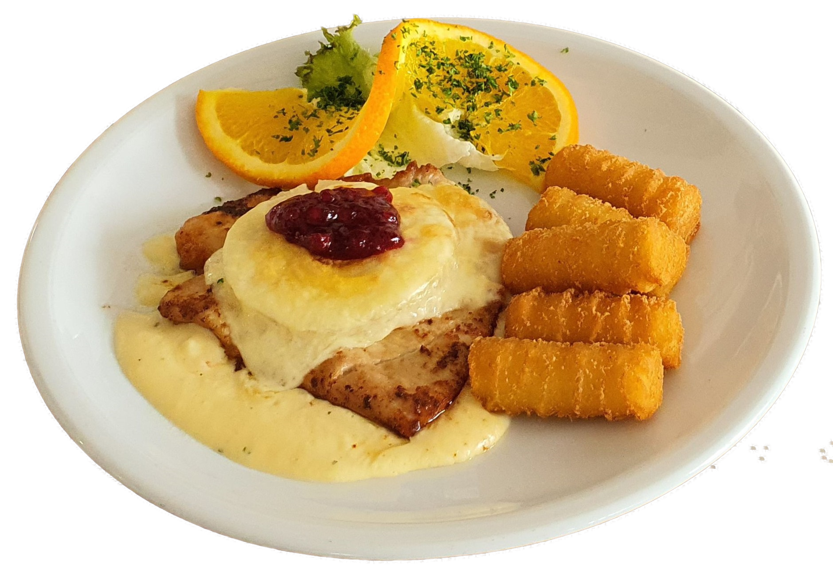 Putenbrust "Hawaii" mit Kroketten & Beilagensalat